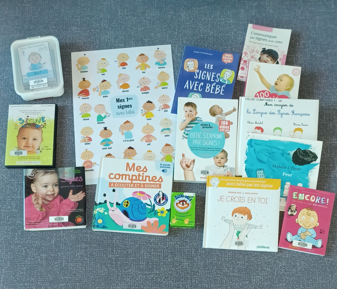 Jeu : 52 cartes pour signer avec bébé 8112 DVD : signe avec moi 3811 Jeu : Alpha cat’s 3264 Livres Communiquer par signes avec bébé 4944 100 activités pour signer et communiquer avec bébé 3582 Bébé...